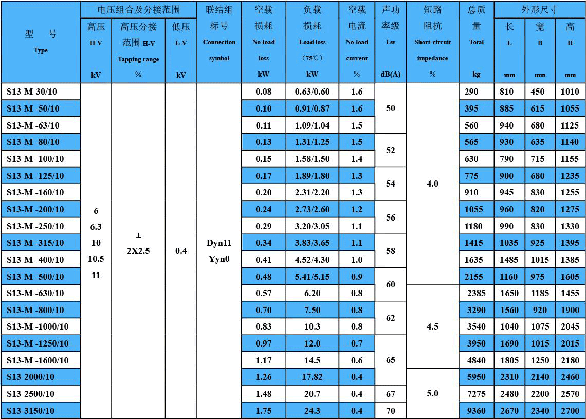 S13型10kV双绕组系列主要产品性能参数: