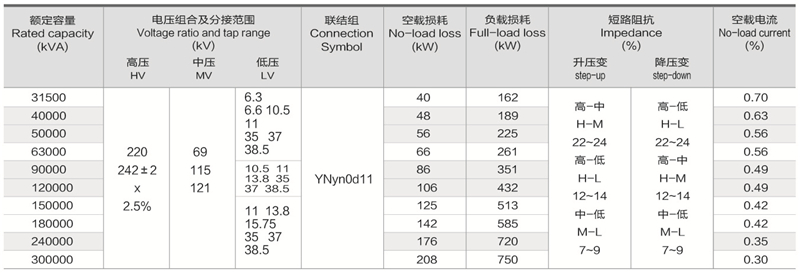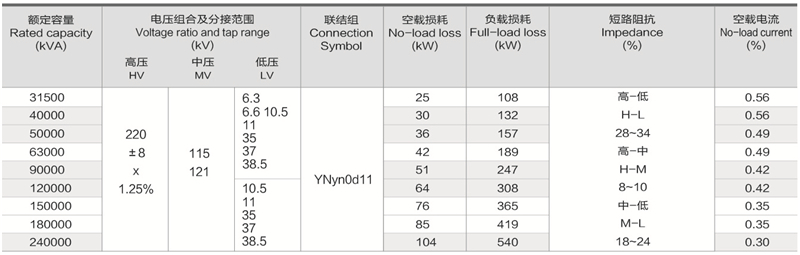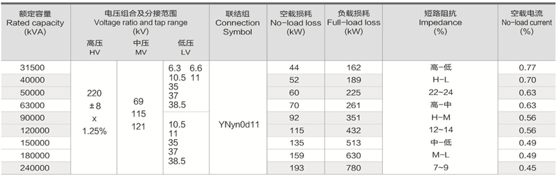 华信220kV三绕组无励磁调压电力变压器技术参数: