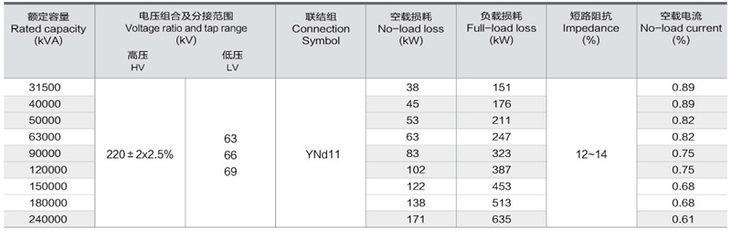 华信220kV双绕组无励磁调压电力变压器技术参数: