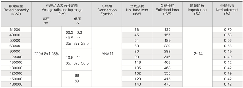 华信制造低压为66kV级220kV双绕组无励磁调压电力变压器技术参数: